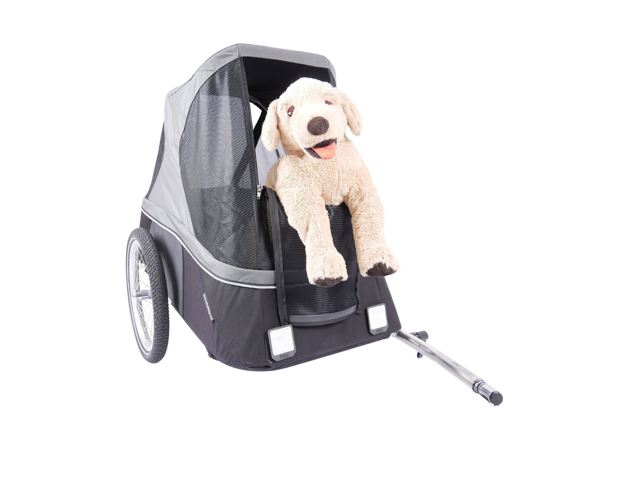 What makes the Cyclone Dog Trailer so special? It is compact, foldable (easily fits under your bed when folded), and has a low entry for your four-legged friend. Use it as a bench (also for the car), complete with a supplied leash for securing your dog. Ventilation is possible through the front and back, and for extra visibility during the day and night, reflectors, reflective piping, and a lamp holder are added. An optional removable dog cushion is available.